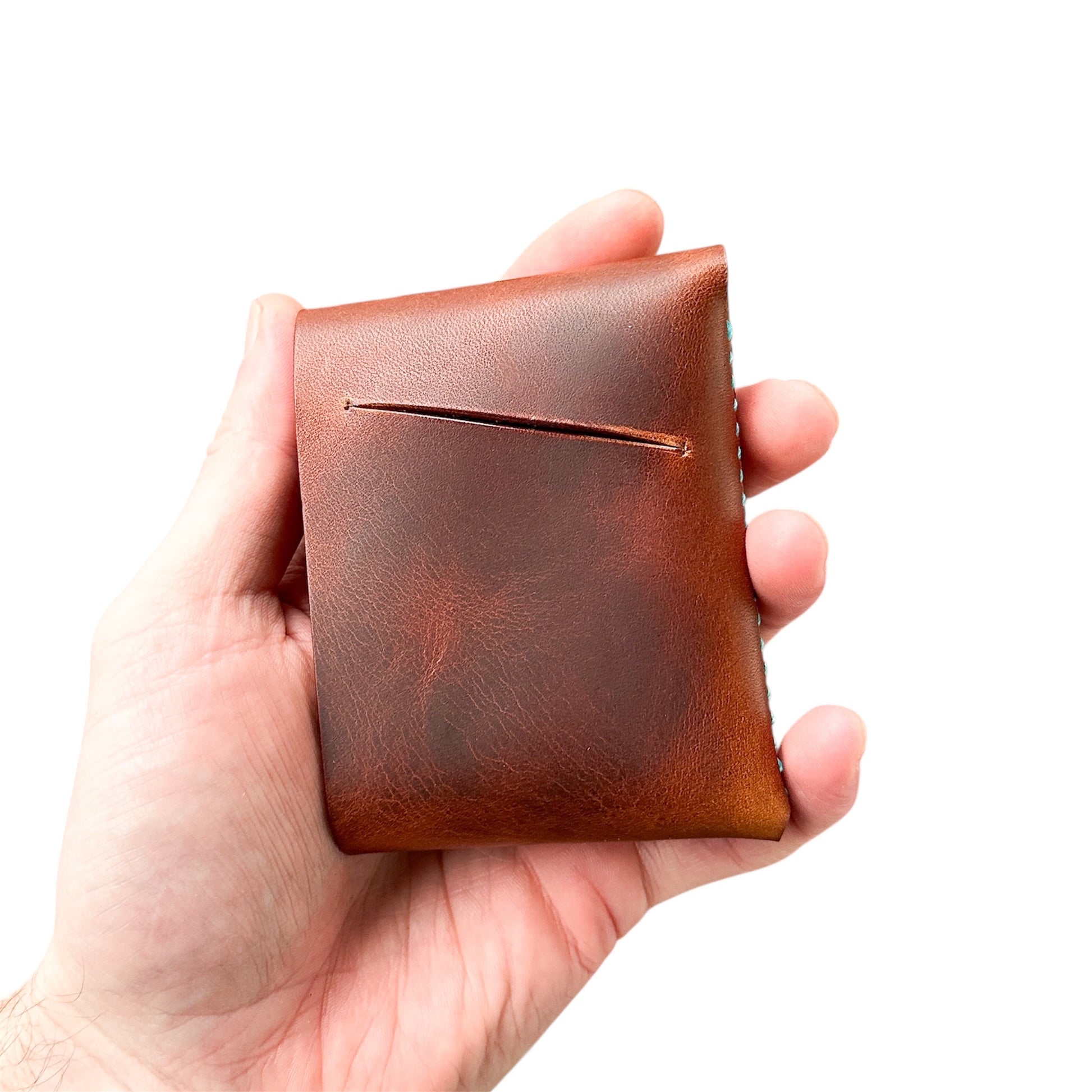 The Scottish Fold mini just like the Original SF but smaller and is still all you need. One main pocket for cards (holds up to 8 comfortably) and then a quick access back divider pocket for quarter folded bills.